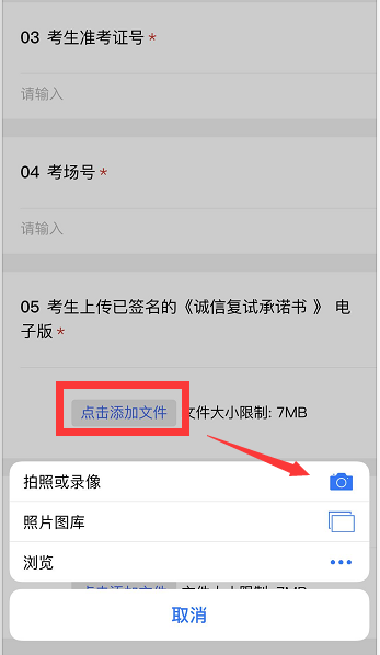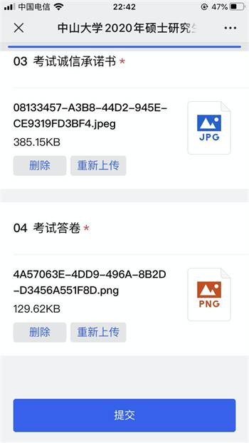 4.筆試結束后,所有考生不得繼續(xù)作答。考生根據(jù)監(jiān)考員要求,依序舉起3張答題紙,由監(jiān)考員進行截圖。然后根據(jù)監(jiān)考員要求,取回輔機位手機或平板電腦,登錄與本院工作人員聯(lián)系的微信號,掃描監(jiān)考員通過騰訊會議發(fā)布的二維碼,進入答卷提交系統(tǒng),填寫相關信息并完成承諾書及答卷的拍照和上傳(通過即時“拍照”上傳,每頁答卷單獨拍照,單獨上傳),上傳完畢后點擊【提交】完成考卷上交。全程必須保持主機位仍處于開啟狀態(tài),且考生一直處在主機位的視頻畫面中。