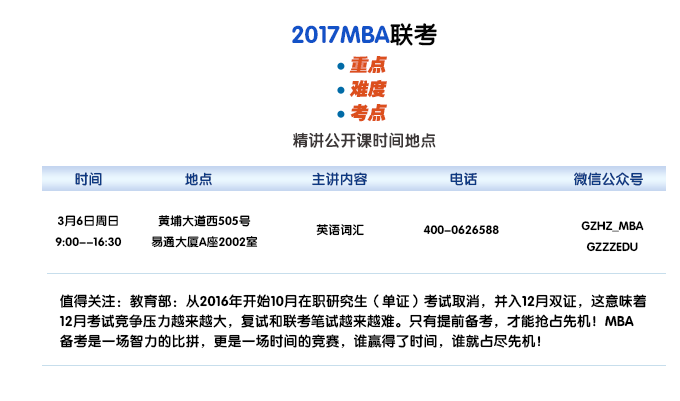 2017MBA/MPAcc聯(lián)考英語詞匯班將于3月6日周日9:00--16:30在黃埔大道西505號易通大廈A座2002室開課
