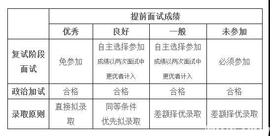 參加提前面試獲得一般者,如聯(lián)考成績達(dá)到初試分?jǐn)?shù)線(含總分和單科分),可自主選擇是否參加復(fù)試階段面試(最終成績以兩次面試中更優(yōu)的計入);政治加試合格,經(jīng)初試復(fù)試總分加和后,按照差額錄取原則擇優(yōu)錄取。