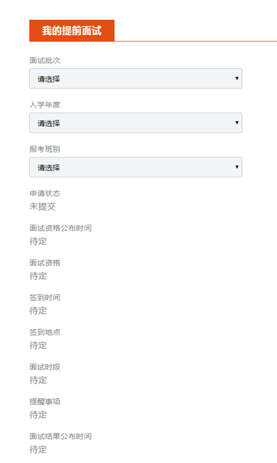 成功申請(qǐng)后,頁面會(huì)有對(duì)話框彈出;該頁面刷新以后,可以看到您已經(jīng)申請(qǐng)的面試批次、入學(xué)年度、報(bào)考班別、申請(qǐng)狀態(tài)(為“已提交”),并看到相應(yīng)批次的面試資格公布時(shí)間以及面試結(jié)果公布時(shí)間。